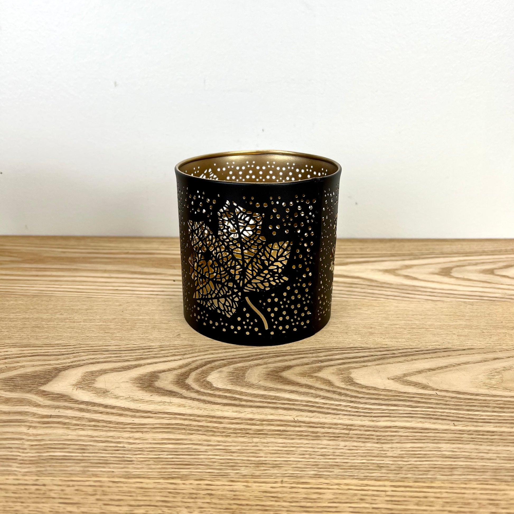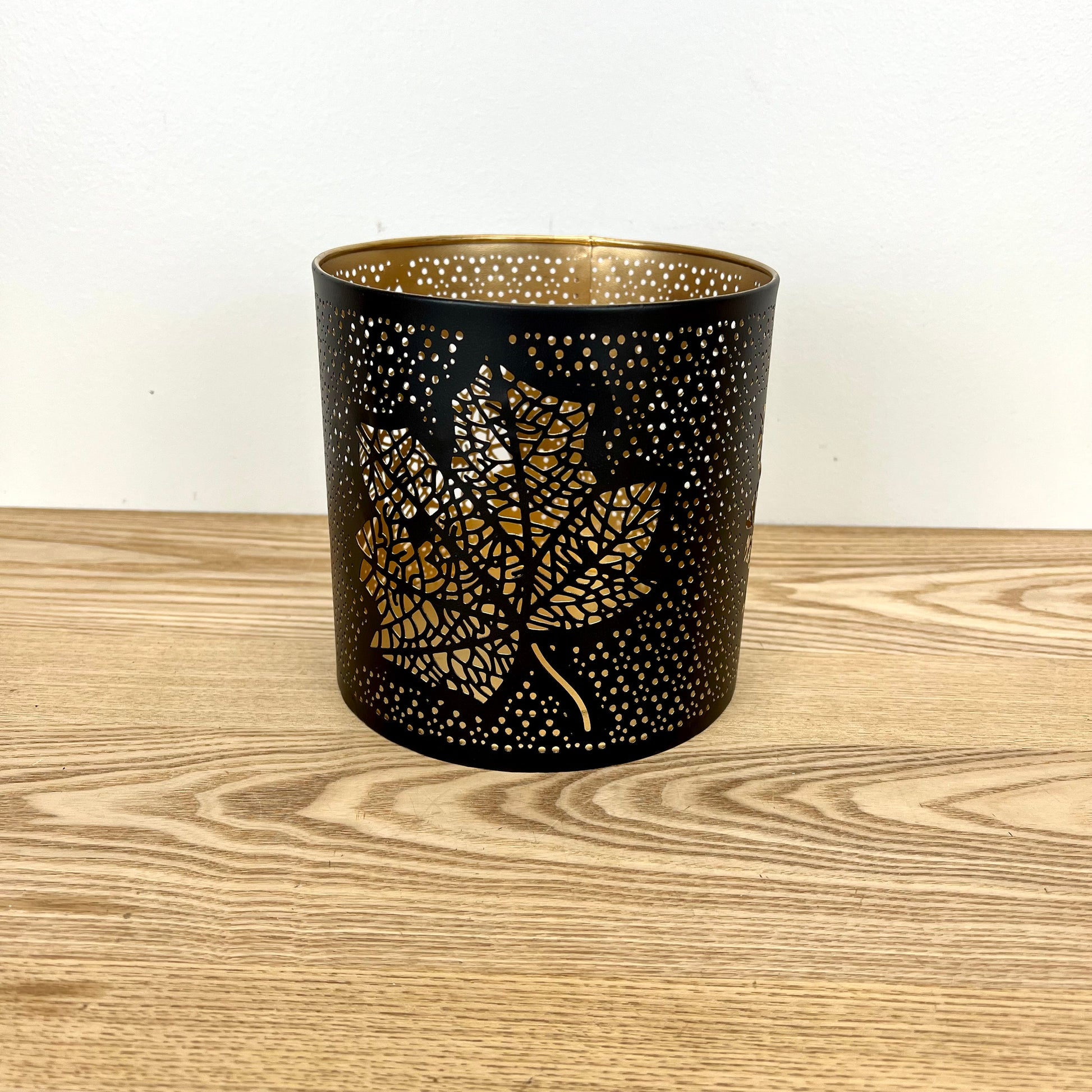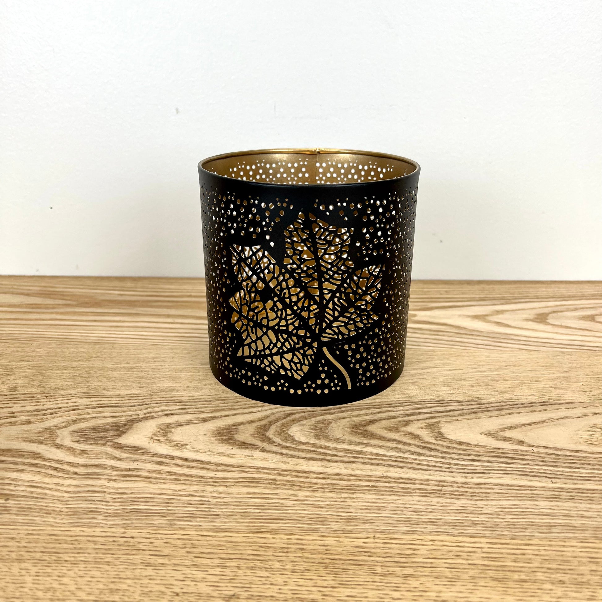 Metal lanterns with matte black finish and gold interior for added glow.
