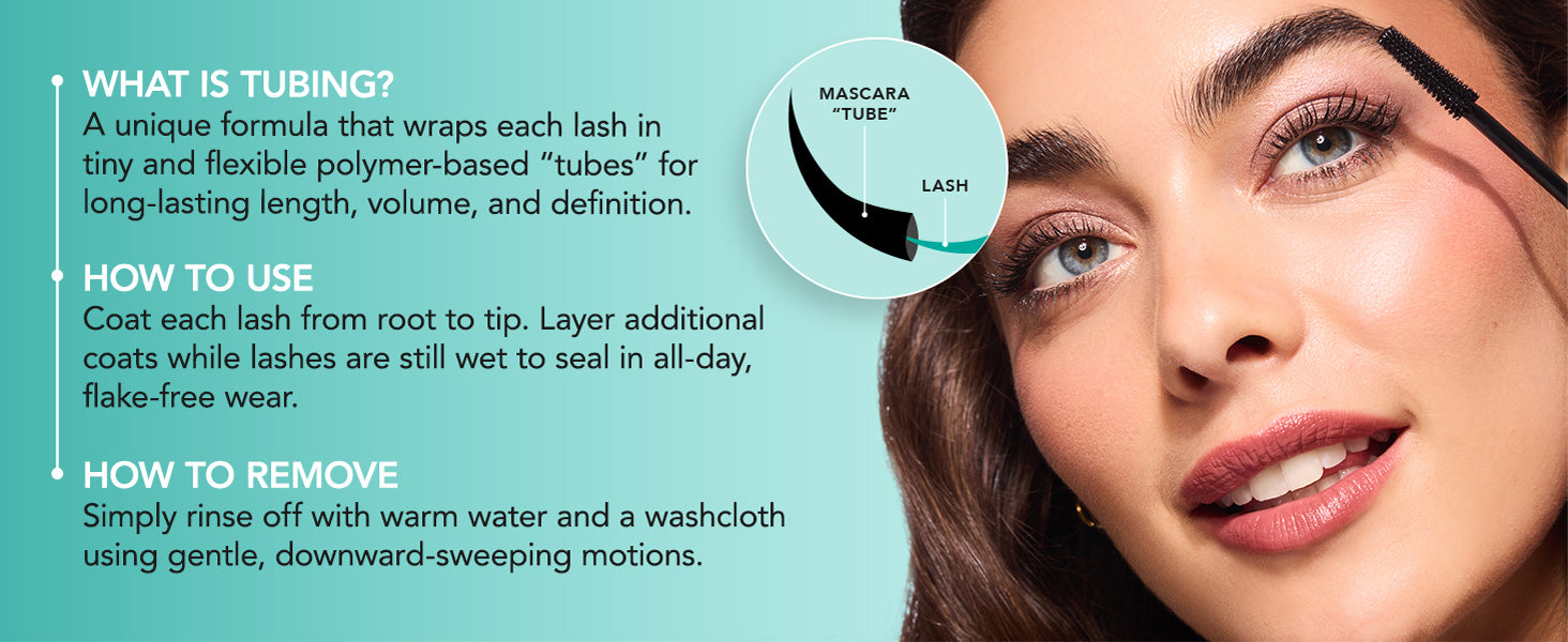 Tubing is a formula that coats lashes in flexible polymers for lasting length, volume, and easy removal with warm water.