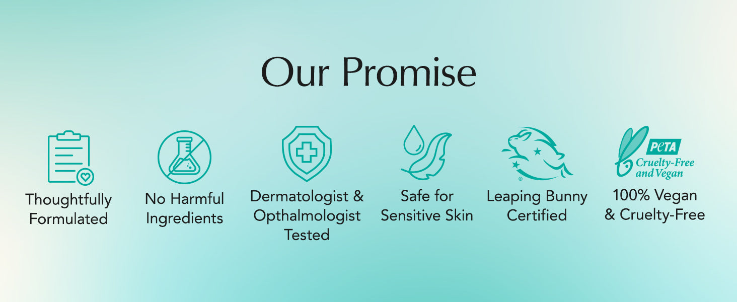 Cruelty-free, vegan, dermatologist-tested, ophthalmologist-approved, safe for sensitive skin, with no harmful ingredients and Leaping Bunny certification.