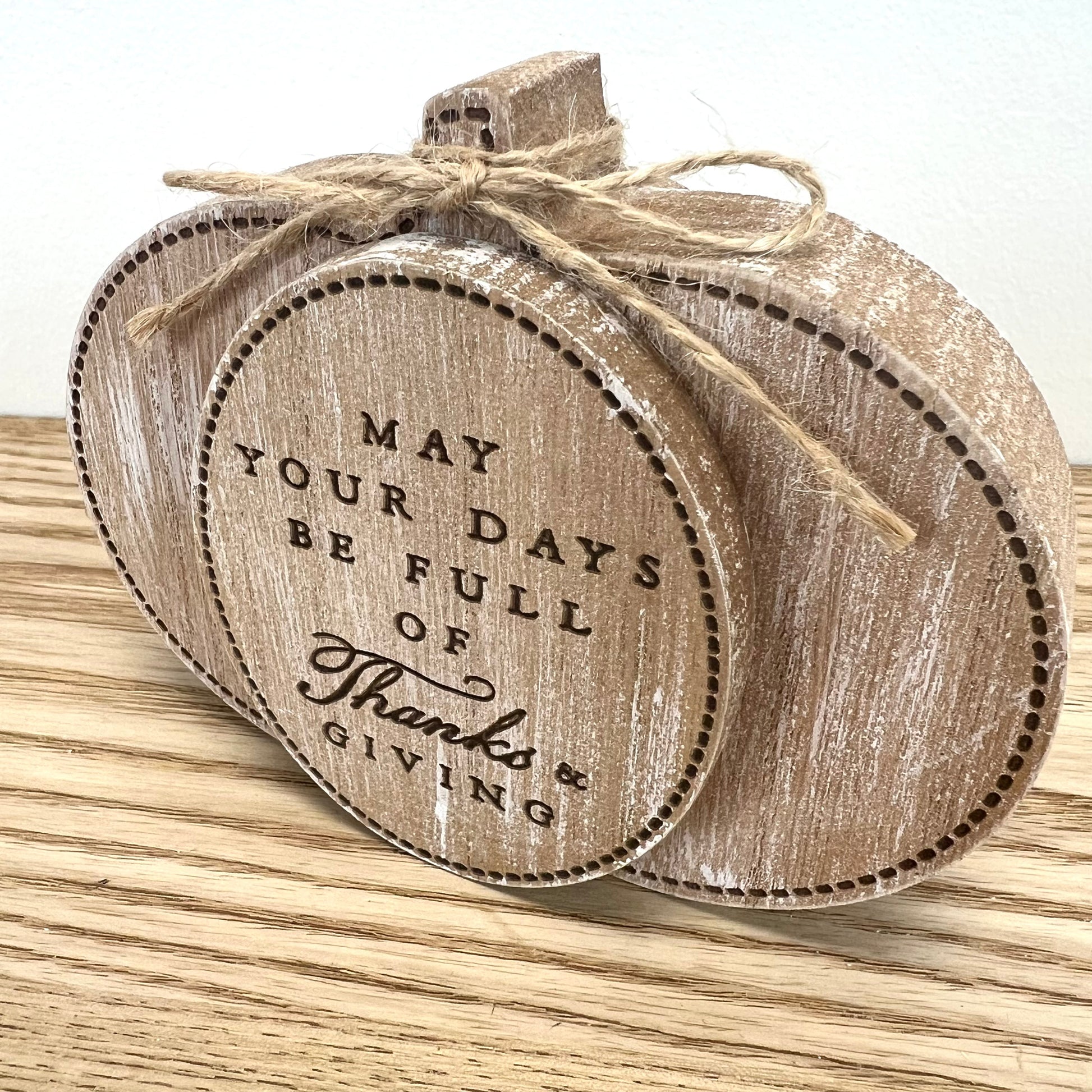 Wooden pumpkin with “May your days be full of thanks & giving” on one side and “Tis the season to be scary” on the other.