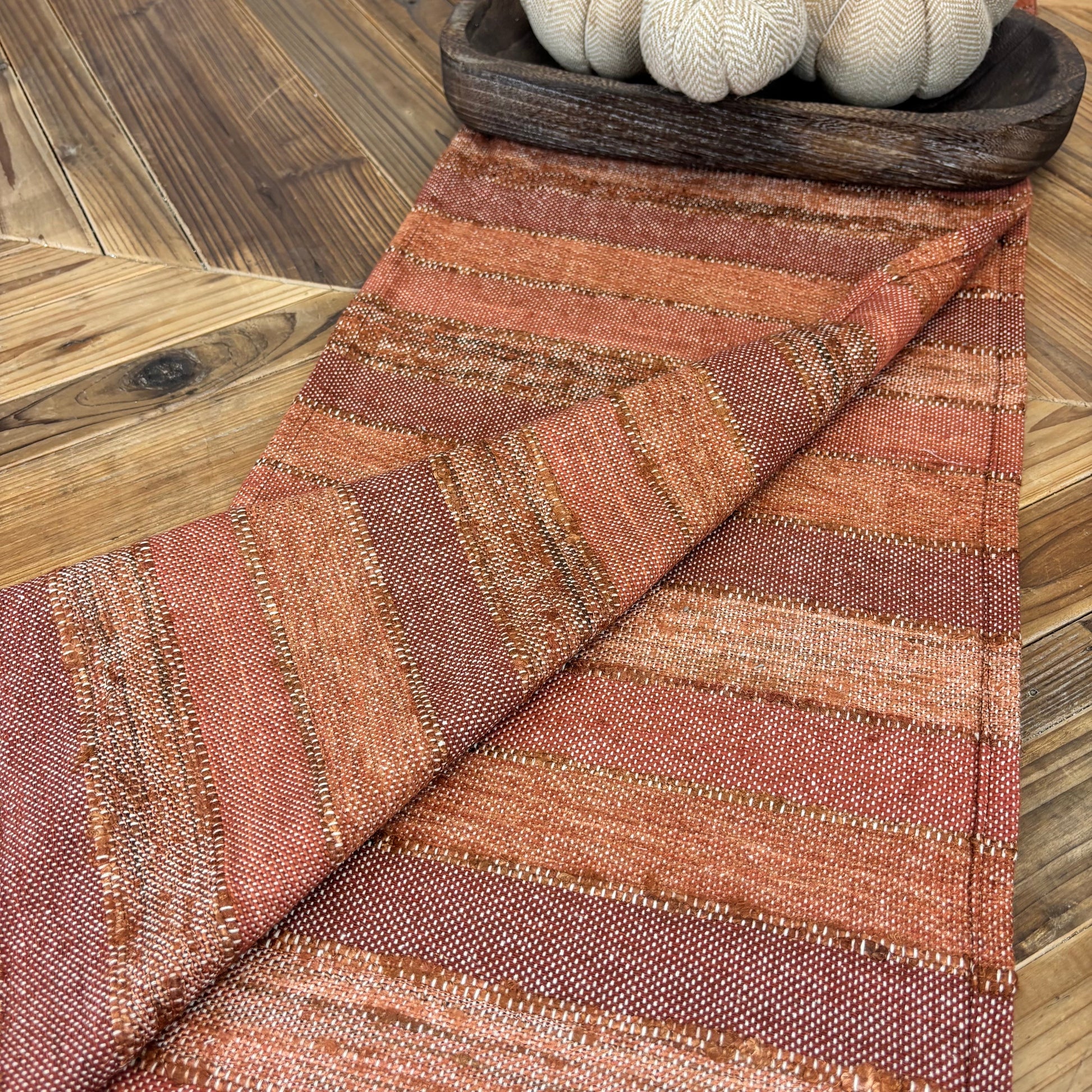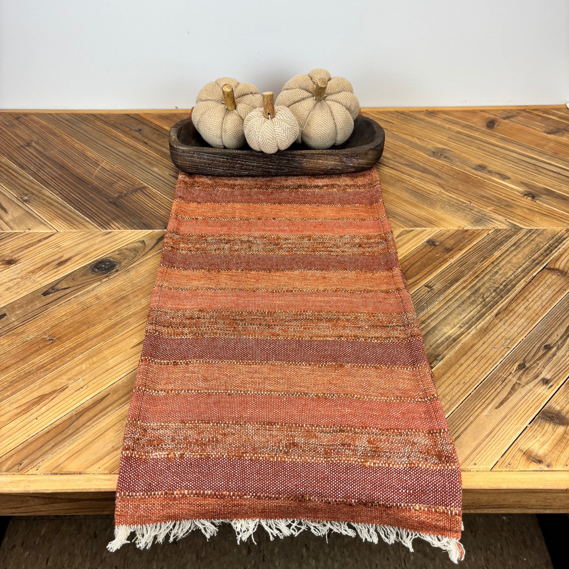 Woven blend slub striped table runner w/ frayed edges. (Each one will vary)